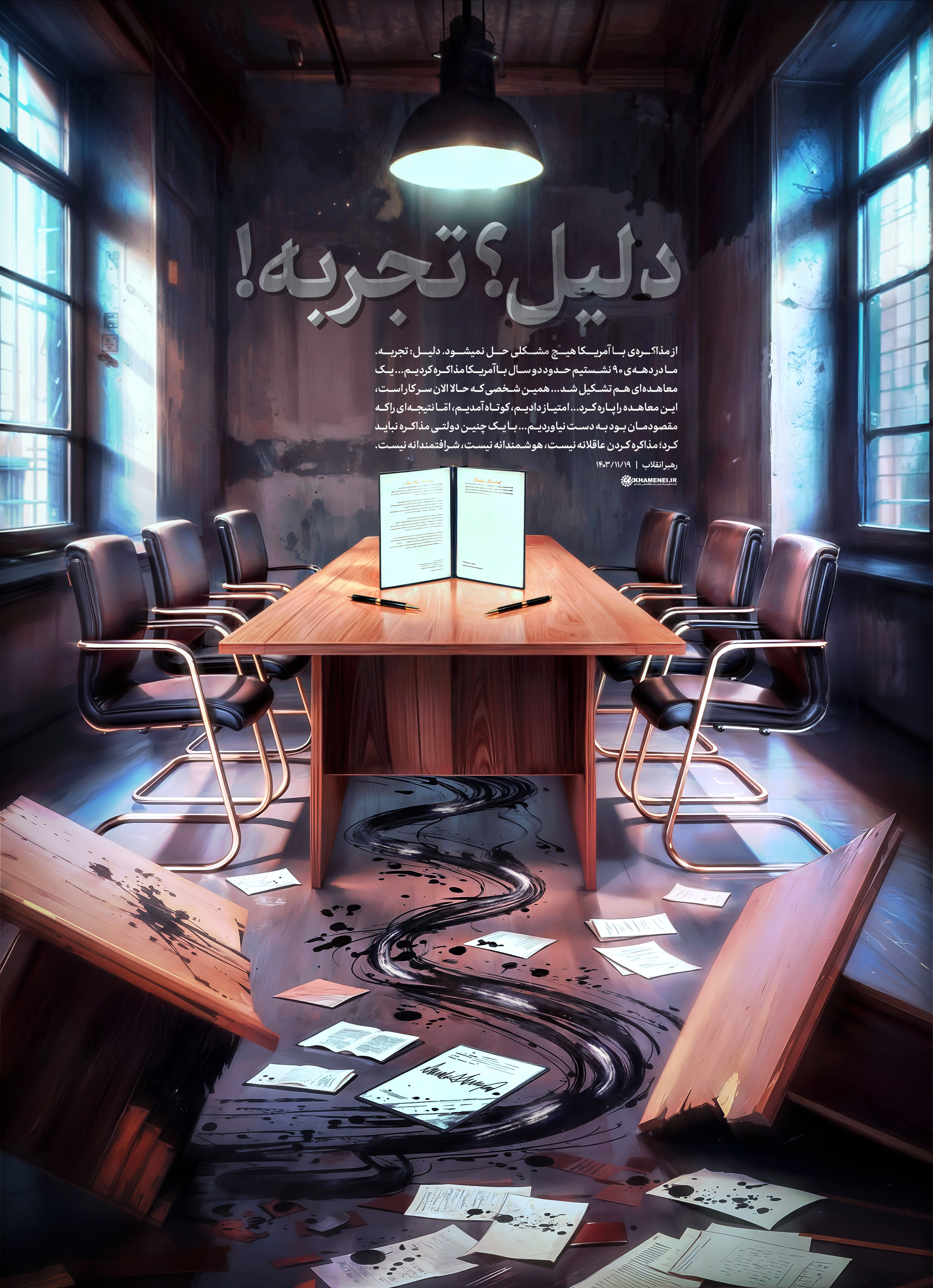 حضرت آیتالله امام خامنهای: «از مذاکرهی با آمریکا هیچ مشکلی حل نمیشود. دلیل: تجربه. ما در دههی ۹۰ نشستیم حدود دو سال با آمریکا مذاکره کردیم... یک معاهدهای هم تشکیل شد... همین شخصی که حالا الان سر کار است، این معاهده را پاره کرد... امتیاز دادیم، کوتاه آمدیم، امّا نتیجهای را که مقصودمان بود به دست نیاوردیم... با یک چنین دولتی مذاکره نباید کرد؛ مذاکره کردن عاقلانه نیست، هوشمندانه نیست، شرافتمندانه نیست.» ۱۴۰۳/۱۱/۱۹