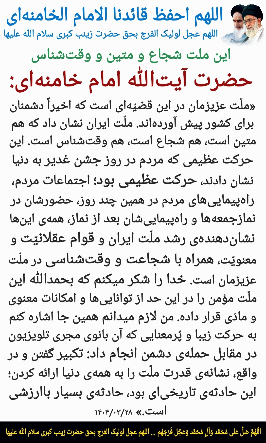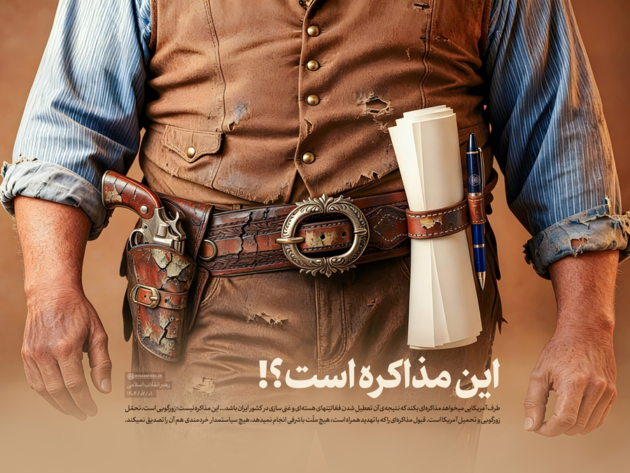 حضرت آیتالله امام خامنهای: «طرف آمریکایی میخواهد مذاکرهای بکند که نتیجهی آن تعطیل شدن فعّالیّتهای هستهای و غنیسازی در کشور ایران باشد... این مذاکره نیست؛ زورگویی است، تحمّل زورگویی و تحمیل آمریکا است. قبول مذاکرهای را که با تهدید همراه است، هیچ ملّت باشرفی انجام نمیدهد، هیچ سیاستمدار خردمندی هم آن را تصدیق نمیکند.» ۱۴۰۴/۷/۱