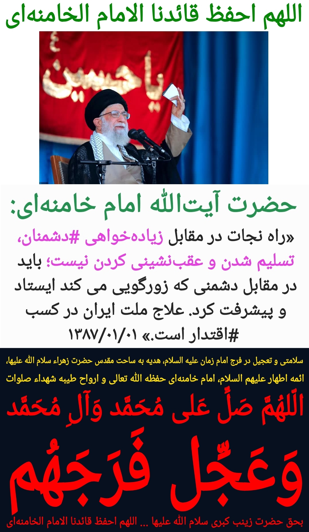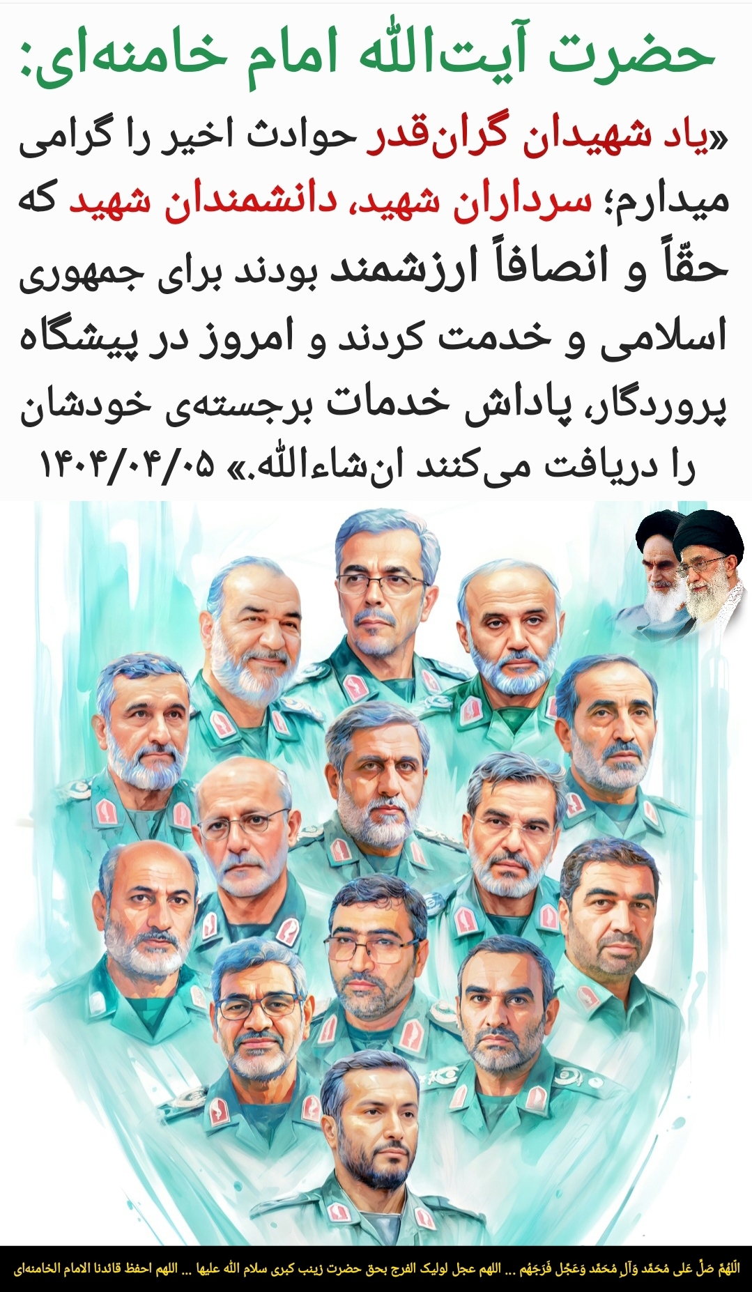 سلامتی و تعجیل در فرج امام زمان علیه السلام، هدیه به ساحت مقدس حضرت زهراء سلام الله علیها، ائمه اطهار علیهم السلام، امام خامنهای حفظه الله تعالی و ارواح طیبه شهداء صلوات